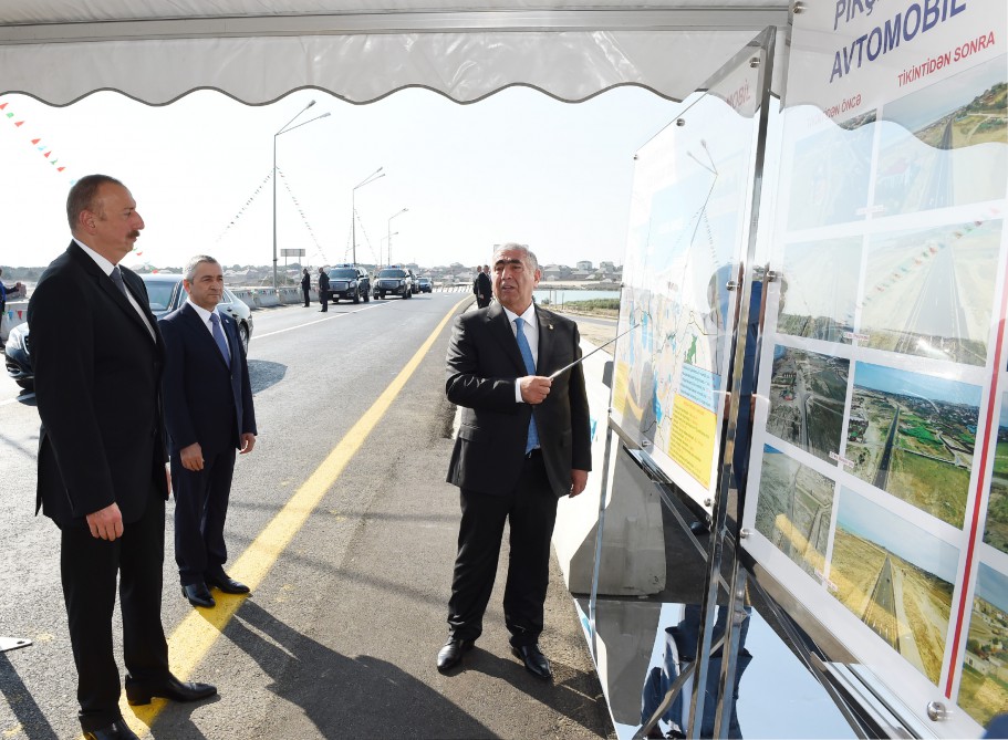 Azərbaycan prezidenti İlham Əliyev yenidən qurulan Pirşağı-Novxanı dənizkənarı və Binəqədi-Novxanı-Corat avtomobil yollarının açılışında iştirak edib. SİA-nın xəbərinə görə, “Azəravtoyol” Açıq Səhmdar Cəmiyyətinin sədri Saleh Məmmədov dövlətimizin başçısına görülən işlərlə bağlı məlumat verib.