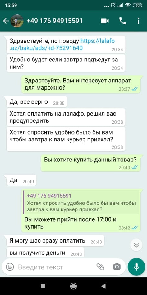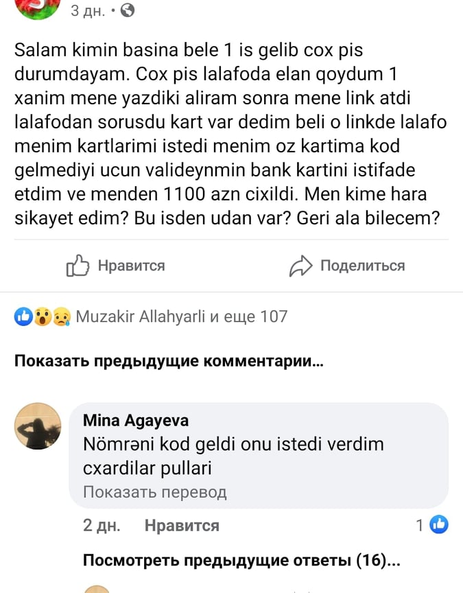 Aşağıdakı fotolarda 1 nəfər aldadılan və hesabından 1100 manat pulu oğurlanan (feysbuk skrin fotosuna bax- red) və 1 nəfər aldanmayan vətəndaşın mesajları (messencer skrin fotolarına bax-red) verilib.