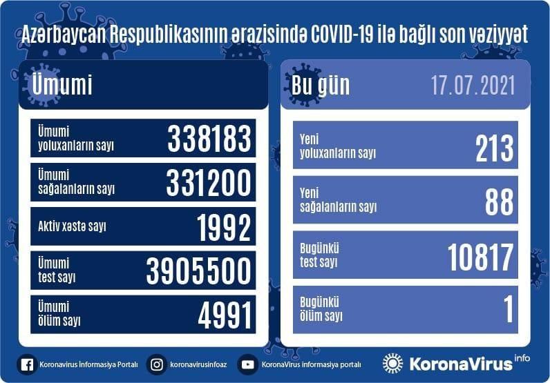 Azərbaycanda koronavirus infeksiyasına daha 213 yeni yoluxma faktı qeydə alınıb, 88 nəfər müalicə olunaraq sağalıb və evə buraxılıb.