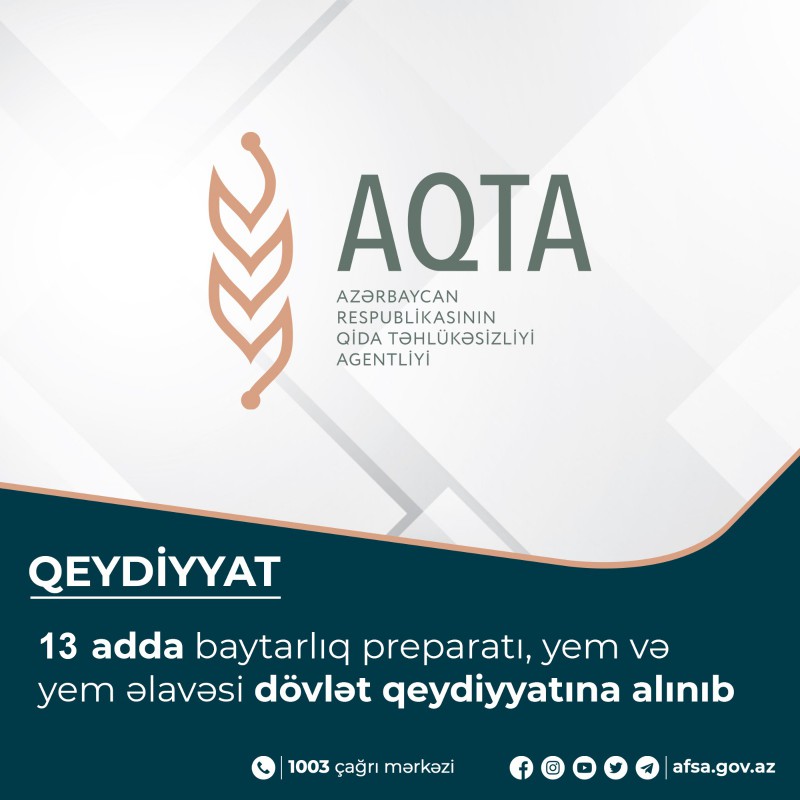 “Baytarlıq haqqında” Azərbaycan Respublikasının qanununa əsasən baytarlıq preparatlarının, onlara aid sənəd və materialların ekspertizası və qeydiyyat sınağının nəticələrinə görə qanunvericiliklə müəyyən edilmiş qaydada baytarlıq preparatlarının dövlət reyestrinə daxil edilməsi və bu barədə müvafiq formada hazırlanmış qeydiyyat şəhadətnaməsinin verilməsi Azərbaycan Respublikasının Qida Təhlükəsizliyi Agentliyi (AQTA) tərəfindən həyata keçirilir. AQTA-dan SİA-ya verilən məlumata görə, bununla əlaqədar olaraq, 9-13 avqust 2021-ci il tarixlərində AQTA tərəfindən ümumilikdə 13 adda baytarlıq preparatı, yem və yem əlavəsi dövlət qeydiyyatına alınaraq qeydiyyat şəhadətnaməsi sifarişçiyə təqdim olunub. Qeydiyyata alınan baytarlıq preparatlarından 1 ədədi Rusiya, 2 ədədi Vyetnam, 10 ədədi isə Ukrayna istehsalıdır.