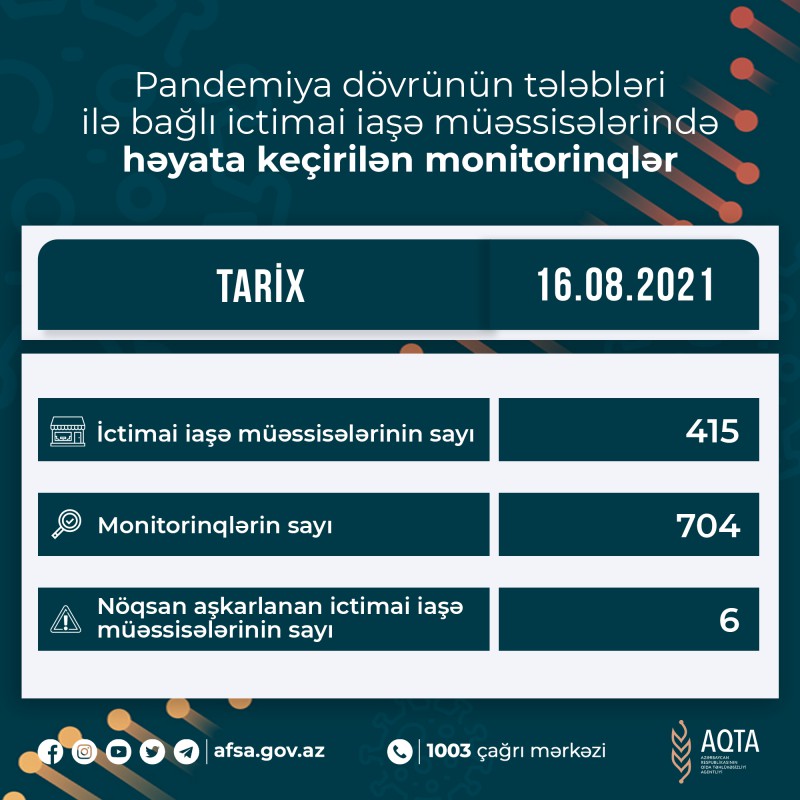 Azərbaycan Respublikasının Qida Təhlükəsizliyi Agentliyi (AQTA) pandemiya dövrünün tələblərinə, bu sahədə müvafiq qanunvericiliyin icrasına, həmçinin yeni növ koronavirusun (COVID-19) profilaktikasına dair Nazirlər Kabinetinin Qərarı ilə təsdiq edilmiş metodiki göstərişlərin icrasına nəzarət məqsədilə ictimai iaşə obyektlərində reydləri davam etdirir. AQTA-dan SİA-ya verilən məlumata görə, nəzarət tədbirləri çərçivəsində 2021-ci il avqustun 16-da ölkə üzrə 415 ictimai iaşə obyektində 704 monitorinq keçirilib. Monitorinqlər zamanı 6 müəssisədə qanunvericiliyin tələblərinin kobud şəkildə pozulması faktları aşkar olunub. Aşkar edilmiş nöqsanlarla bağlı İnzibati Xətalar Məcəlləsinə uyğun olaraq müvafiq tədbirlər görülüb.