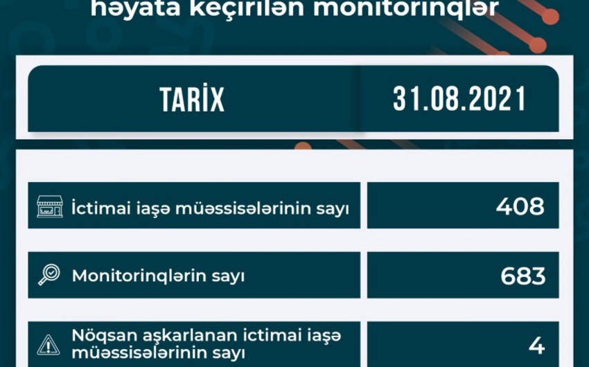 Azərbaycan Respublikasının Qida Təhlükəsizliyi Agentliyi (AQTA) pandemiya dövrünün tələblərinə, bu sahədə müvafiq qanunvericiliyin icrasına, həmçinin yeni növ koronavirusun (COVID-19) profilaktikasına dair Nazirlər Kabinetinin Qərarı ilə təsdiq edilmiş metodiki göstərişlərin icrasına nəzarət məqsədilə ictimai iaşə obyektlərində reydləri davam etdirir. SİA xəbər verir ki, nəzarət tədbirləri çərçivəsində 2021-ci il avqustun 31-də ölkə üzrə 408 ictimai iaşəobyektində 683 monitorinq keçirilib. Monitorinqlər zamanı 4 müəssisədə qanunvericiliyin tələblərinin kobud şəkildə pozulması faktları aşkar olunub. Aşkar edilmiş nöqsanlarla bağlı İnzibati Xətalar Məcəlləsinə uyğun olaraq müvafiq tədbirlər görülüb.