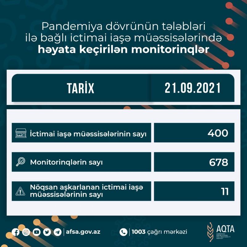 Qeyd edək ki, AQTA tərəfindən Bakıda, eləcə də regionlarda fəaliyyət göstərən ictimai iaşə obyektlərində monitorinqlərin miqyası genişləndirilib. Hazırda AQTA müfəttişləri tərəfindən respublika üzrə monitorinqlər davam etdirilir və qaydalara əməl etməyən sahibkarlıq subyektləri barədə ən sərt tədbirlər görüləcəkdir.