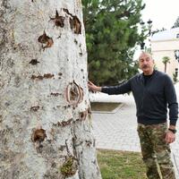 Sonra Prezident İlham Əliyev Tərtər şəhərinin mərkəzində Ermənistan silahlı birləşmələri tərəfindən rayona müxtəlif tipli reaktiv yaylım atəşi sistemləri və artilleriya qurğularından atılmış mərmilərə baxıb.