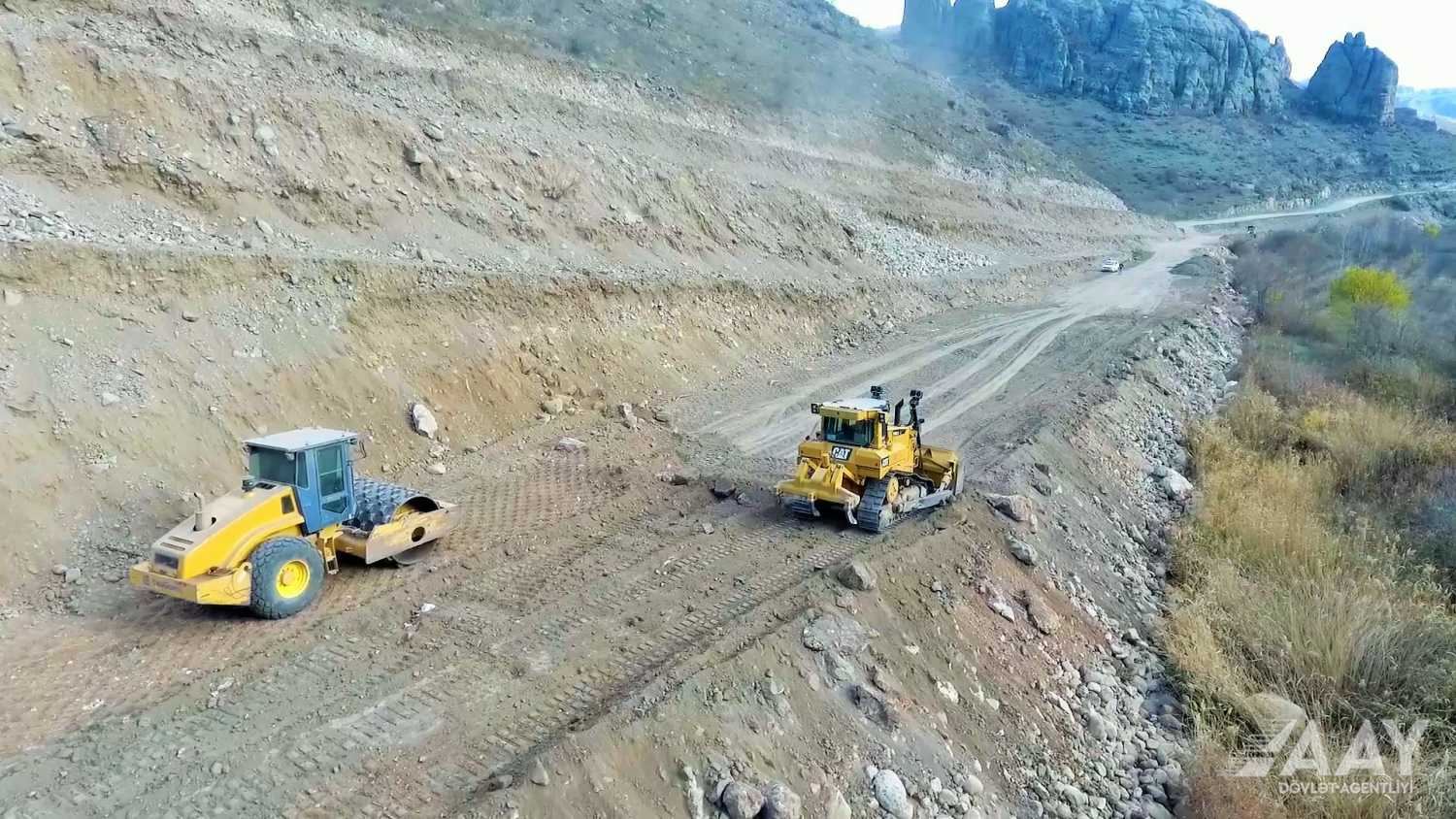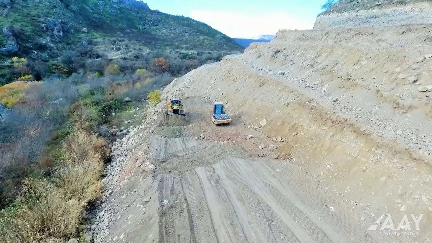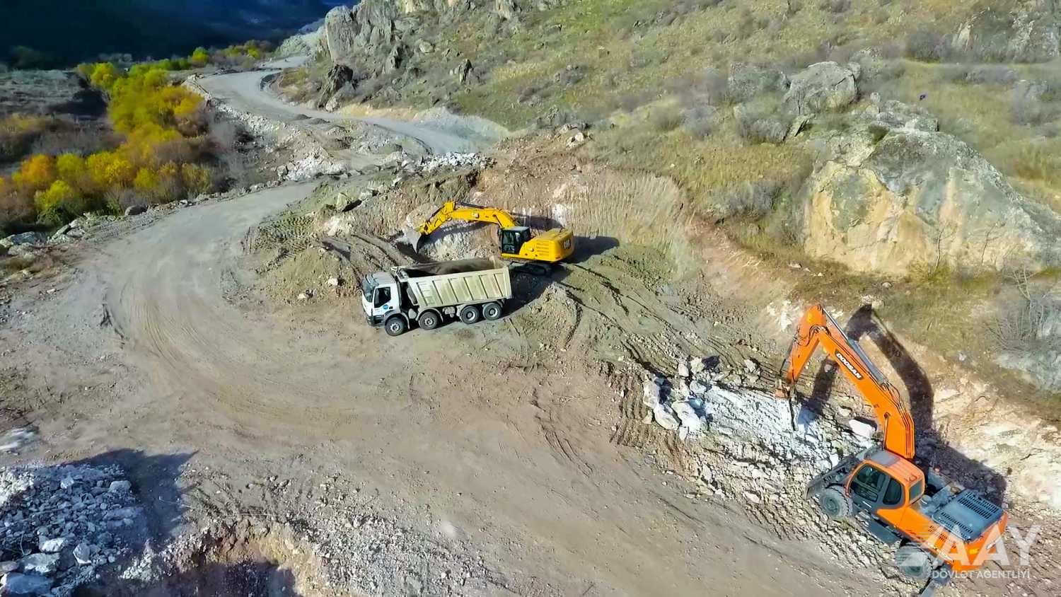 “İnşaat Norma və Qaydaları”na uyğun olaraq Qubadlı rayonu ərazisində Eyvazlı kəndinə gedən və çətin relyefə malik ərazidən keçən avtomobil yolunun layihə eninin alınması üçün qaya qruntları dağıdılmaqla torpaq yatağının tikintisi işləri davam etdirilir.