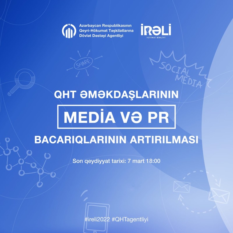 “İrəli” İctimai Birliyi Azərbaycan Respublikasının Qeyri-Hökumət Təşkilatlarına Dövlət Dəstəyi Agentliyinin dəstəyi ilə “QHT Əməkdaşlarının Media və PR Bacarıqlarının Artırılması” layihəsini həyata keçirəcək. SİA xəbər verir ki, layihənin əsas məqsədi qeyri-hökumət təşkilatları əməkdaşlarının bilik və bacarıqları artırmaq, onların fəaliyyətlərinin mətbuat və sosial şəbəkələrə çıxış imkanlarını gücləndirməkdir. Habelə QHT-lər tərəfindən aparılan PR-ın səmərəliliyinin yüksəldilməsinə nail olmaq, həyata keçirilən təlim və görüşlərlə kütləvi informasiya vasitələri ilə yeni əməkdaşlıqlar qazanmaq, o cümlədən mövcud əməkdaşlıqları daha da gücləndirmək layihə çərçivəsində hədəflənən işlər sırasındadır.
