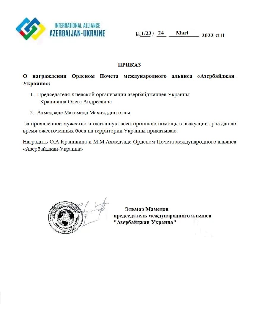Onun sözlərinə görə, bir neçə gün əvvəl Azərbaycanın Milli Qəhrəmanı Viktor Seryoqinin ailəsi Ukraynadakı müharibə bölgəsindən çıxarılaraq Moldovada yerləşdirilib: “Milli Qəhrəmanın ailəsi hazırda Kişinyev şəhərindədir. Viktor Seryoqinin anası Qalina xanım xəstəxanada müalicə alır.