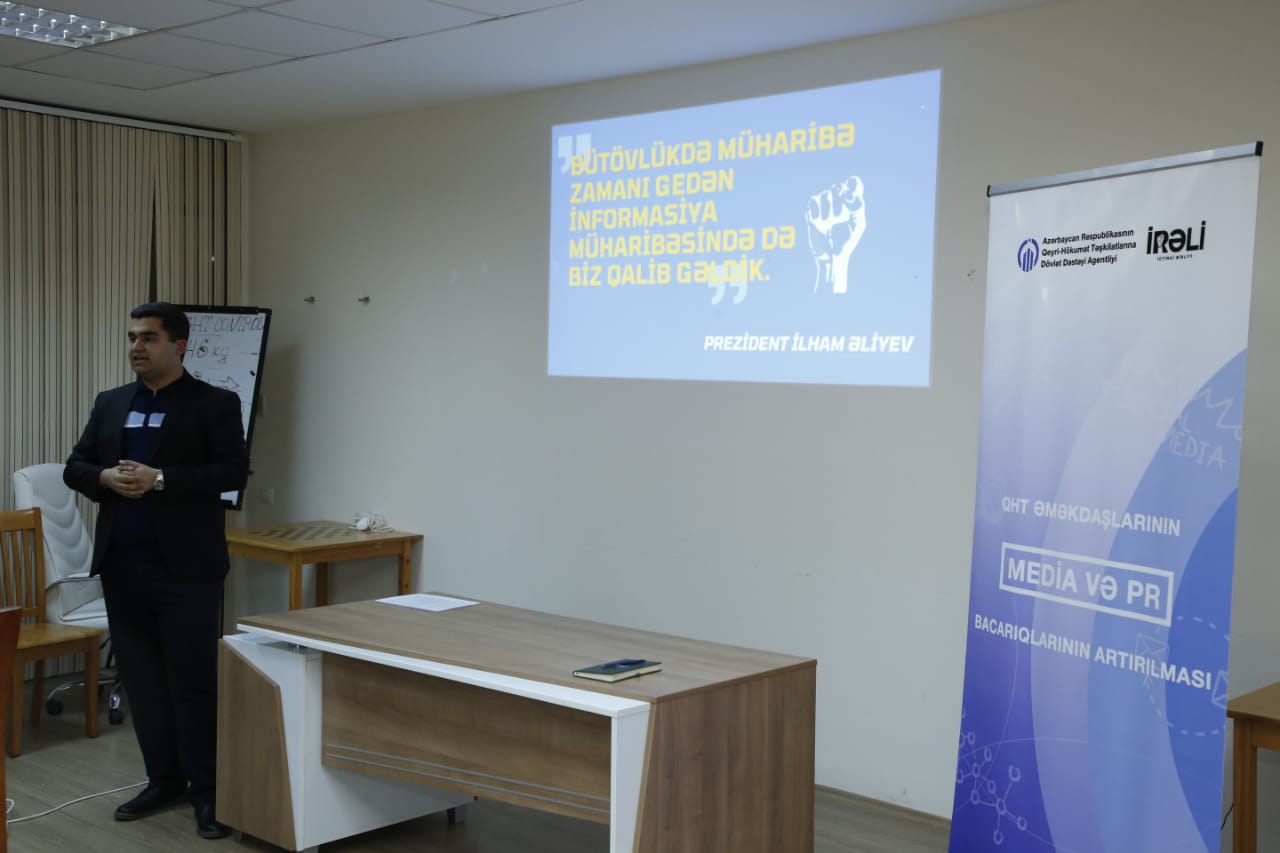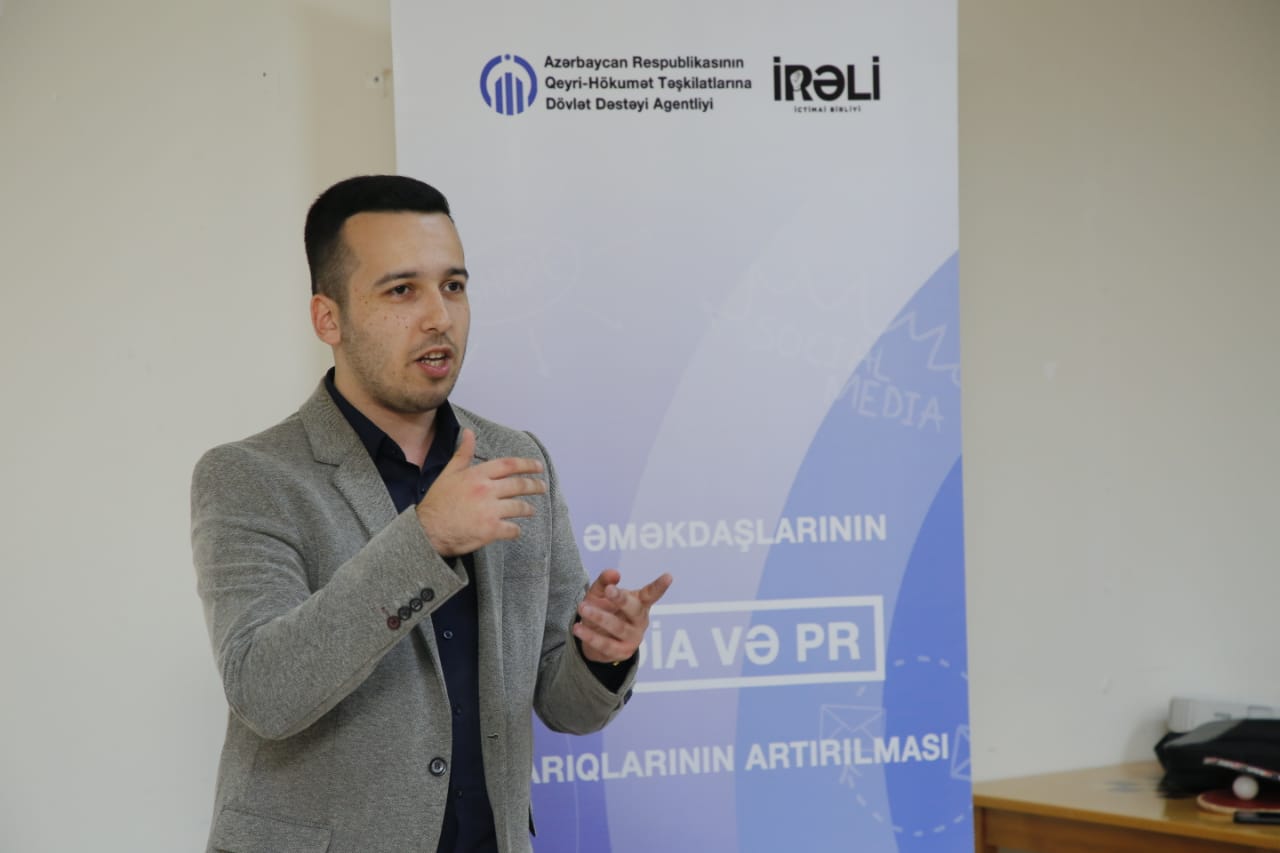 “İrəli” İctimai Birliyinin təşkilatçılığı, Qeyri-Hökumət Təşkilatlarına Dövlət Dəstəyi Agentliyinin dəstəyi ilə “QHT Əməkdaşlarının Media və PR Bacarıqlarının Artırılması” layihəsinə start verilib. Birlikdən SİA-ya verilən məlumata görə, Göygöl rayonununda həyata keçirilən layihə çərçivəsində müxtəlif qeyri-hökumət təşkilatlarını təmsil edən ümumilikdə 35 iştirakçı yeni media mühitindəictimaiyyətlə əlaqələr sisteminin qurulması, sosial mediada düzgün məzmunun yaradılması və idarəedilməsi, müəssəsisələrin brend kimi formalaşmasında sosial şəbəkələrin rolu, faydalı sosial media alətləri, siyasi təqvimlər, siyasi gündəm, qanunvericilik prosedurları ilə iş prinsiplərinin başa düşülməsi, aidiyyəti üzrə müvafiq icrası, uğurlu media tədbirlərinin təşkili və digər mövzular ilə əlaqədar təlim və görüşlərdə iştirak edəcək. Həmçinin layihə çərçivəsində müxtəlif praktiki sessiya, ictimai müzakirə və digər maraqlı tədbirlərin keçirilməsi nəzərdə tutulur.