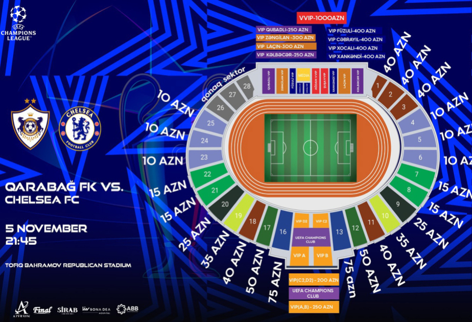 VVIP C və VVIP D sektorlara bilet alaraq, VIP Lounge üstünlüklərindən yararlanmaq istəyən azarkeşlər üçün biletlərin qiyməti isə 200, 250, 300, 400 və 1000 manatdır.