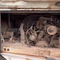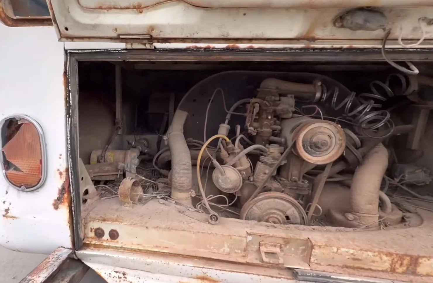 ...Daxili hissədə zibil və tullantılar yığılmışdı və bu da geniş təmizləmə və ovma tələb edirdi. Lakin Volkswagen T1-in mühərriki təəccüblü dərəcədə yaxşı qorunub saxlanılıb. Təmizləndikdən və yağlandıqdan sonra yeni batareya quraşdırılıb və yanacaq əlavə edilib, 51 at gücünə malik 1,5 litrlik düz dörd silindrli mühərrik 100 at gücünə qədər dövr edə bilib.