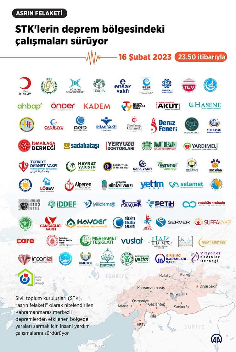 Türkiyədə mərkəzi Kahramanmaraş olan zəlzələlərdən zərər çəkən 10 şəhərdə çox sayda qeyri-hökumət təşkilatları yardım işləri aparır. SİA xəbər verir ki, “Əsrin fəlakəti” olaraq xarakterizə edilən Kahramanmaraşda baş verən zəlzələlərdən zərər çəkən şəhərlərdə başda bir çox vəqf və dərnək olmaqla, türk QHT-ləri təbii fəlakət qurbanlarına dəstək olmaq üçün çalışır.