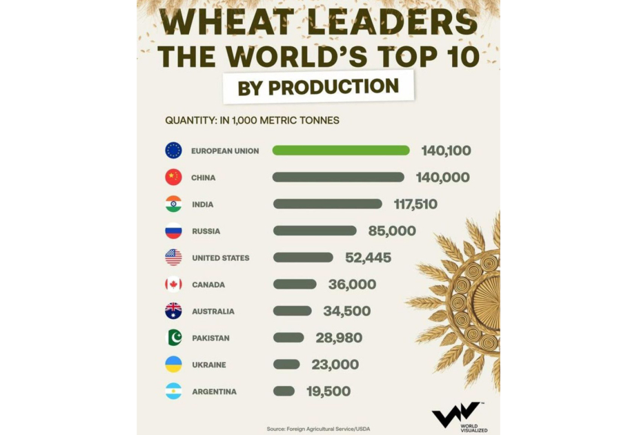 ABŞ Kənd Təsərrüfatı Nazirliyinin Xarici Kənd Təsərrüfatı İnformasiya Xidmətinin (USDA) məlumatlarına görə, cari mövsümdə dünya üzrə buğda istehsalı rekord həddə çatıb. SİA xəbər verir ki, Avropa İttifaqı və Çin, hər biri təxminən 140 milyon ton buğda istehsal edərək birinci yeri bölüşüb və bu sahədə özlərini qlobal liderlər kimi möhkəmləndirib.