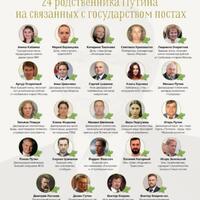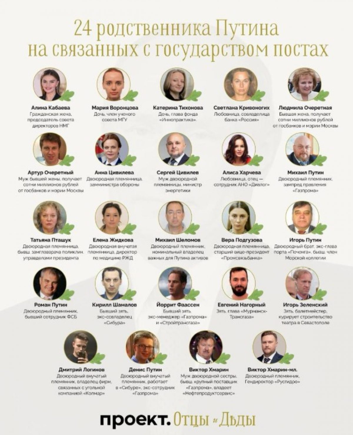 ...Vladimir Putin ən azı 24 qohumunu əhəmiyyətli maliyyə resursları ilə əlaqəli dövlət vəzifələrinə təyin edib. Onların arasında nəvələri də var və bu da onları hakimiyyətdə olan Putinlərin üçüncü nəsli edir.