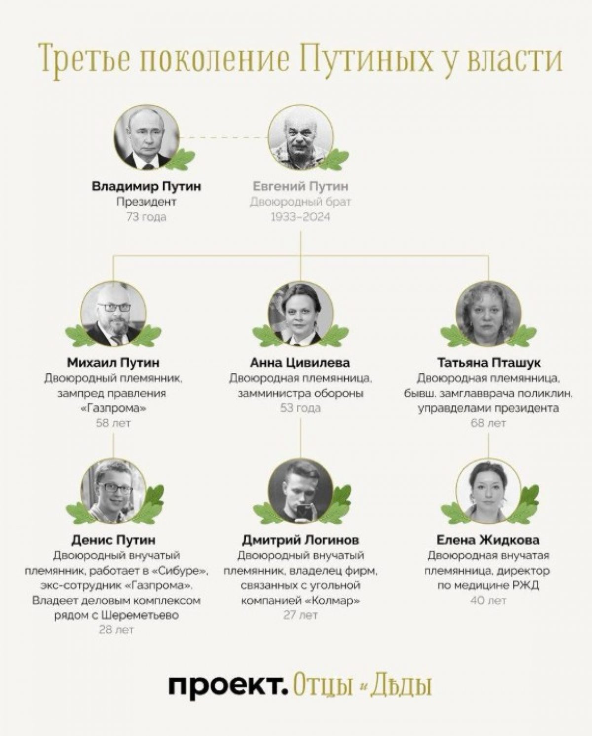 Denis Putin, Dmitri Loginov və Yelena Jidkova dövlət strukturlarında yüksək vəzifələr tutur və külli miqdarda pula çıxışları var. Beləliklə, bu, artıq hakimiyyətdə olan Putinlərin üçüncü nəslidir.
