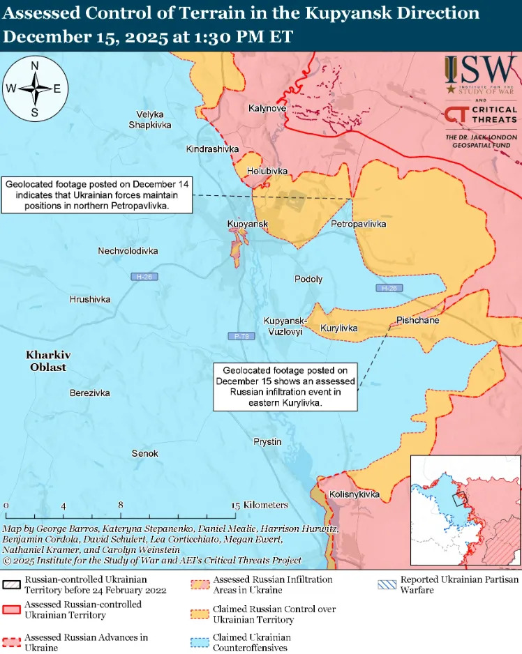 14 və 15 dekabr tarixlərində dərc olunmuş coğrafi yerləşdirilmiş videolar göstərir ki, Rusiya qoşunları, Rusiyanın ərazidə irəliləyiş iddialarına baxmayaraq, Petrovpavlivkada (Kupyanskın şərqi) mövqe tutmamış ola bilərlər.