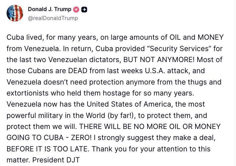 ABŞ prezidenti Donald Tramp yenidən sərt bəyanatlar çıxış edib. SİA-nın məlumatına görə, D.Tramp bildirib ki, illərdir Venesuelanın iqtisadi resursları hesabına ayaqda qalan Kuba artıq bu dəstəkdən məhrum ediləcək.