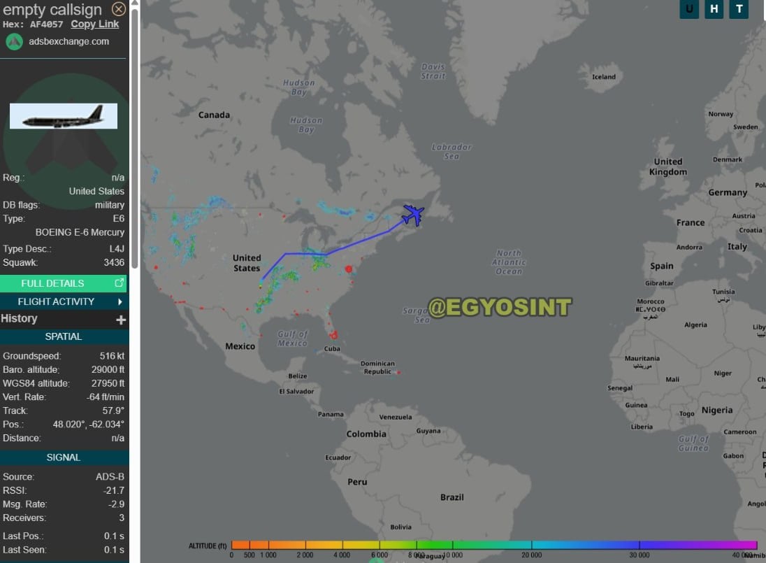 "Qiyamət təyyarəsi" E-6 Mercury-nin qeyri-adi marşrutu Misirin Intel Observer başlığı altında X-də paylaşım edən OSINT analitiki tərəfindən görülüb.