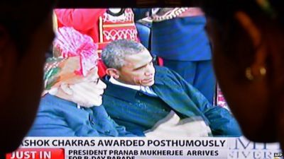 US President Barack Obama is attending India's annual Republic Day parade in Delhi, the first US head of state to do so, on the second day of his visit.