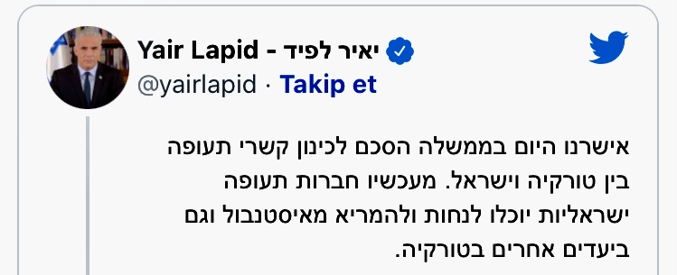 İsrailin baş naziri resmi hesabında qeyd edib ki, Hökumət olaraq biz Türkiyə ilə İsrail arasında aviasiya əlaqələrinin yaradılmasına dair razılaşmanı təsdiqlədik.