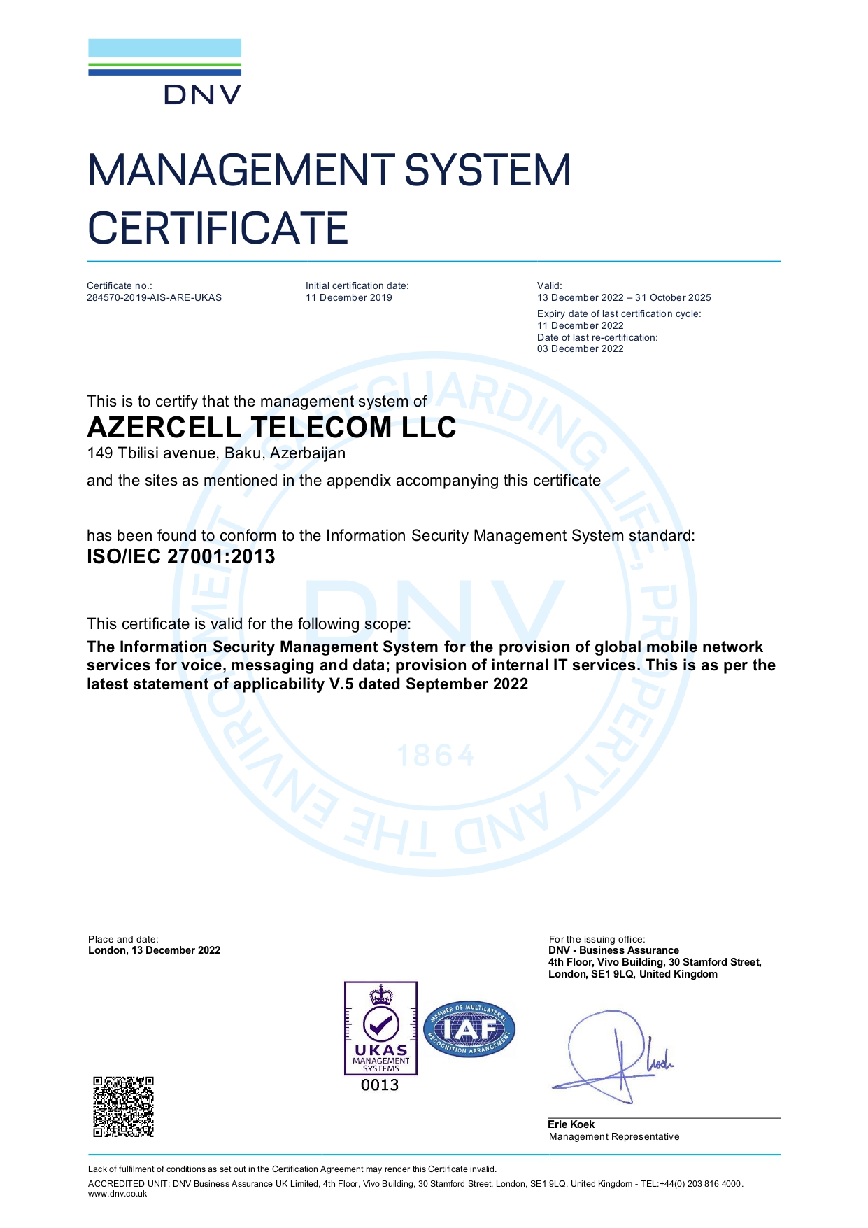 at Azercell is maintained at a high level and meets the requirements of international standards. Azercell Telecom is the first and only mobile operator in the country to be awarded this certificate. The company's compliance with the ISO/IEC 27001 certificate was confirmed for the first time in 2019.