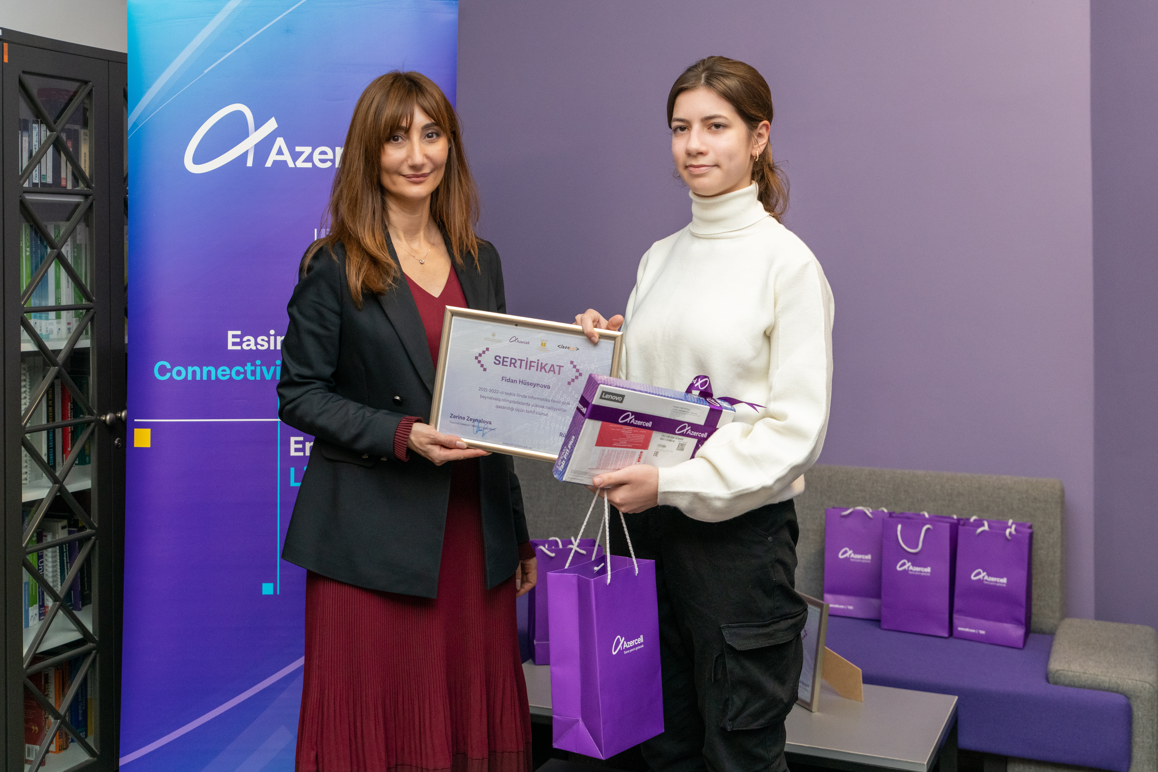 On February 2, on the occasion of Azerbaijani Youth Day celebrated according to an order signed by National Leader Heydar Aliyev, “Azercell Telecom” LLC awarded the young winners of the International Olympiad in Informatics (IOI) from our national team. The meeting held at Azercell’s Head Office was attended by the medalists from the national team, the project manager, teachers, and the operator’s management. At the event, the Olympiad winners KhizriSakhrayev, Fidan Huseynova, Fuad Garayev, and FidanGarayeva were awarded certificates and valuable gifts from Azercell. Participating in the award ceremony, Director of Corporate Communication Department Sona Abbasova, Head of Stakeholder Engagement Section Manager NigarShikhlinskaya, Head of General Education Organization and Management Sector Fuad Garayev, and Senior Specialist of Department for Work with Talented Children Gorkhmaz Mustafayev congratulated the schoolchildren and wished them success in education and raising the Azerbaijani flag in future tournaments.