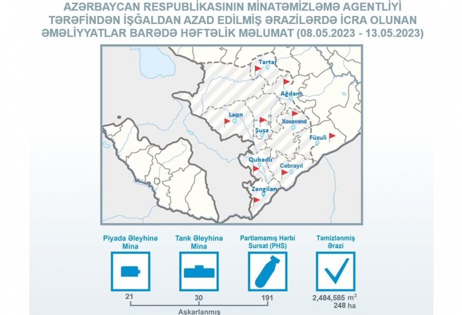 During the mine-clearing operations in Tartar, Aghdam, Khojavand, Lachin, Fuzuli, Shusha, Gubadli, Jabrayil and Zangilan districts, 21 anti-personnel, 30 anti-tank mines, as well as 191 unexploded ordnances (UXO) were found and neutralized from May 8 to 13, Azerbaijan’s Mine Action Agency said in a statement.