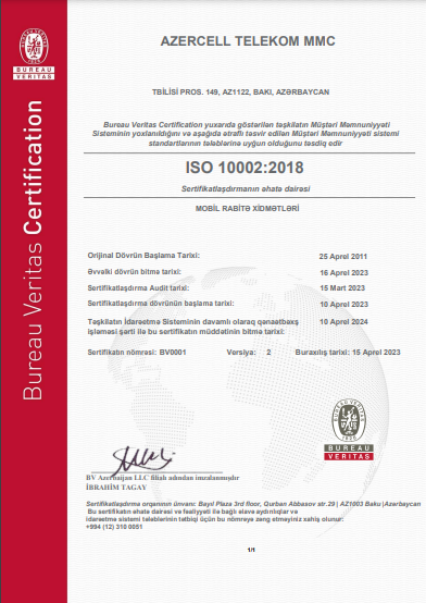 ISO (International Organization for Standardization) is a worldwide federation of national standards bodies (ISO member bodies). The ISO 10002:2018 international standard reviews the process of receiving, considering, answering and resolving complaints related to products and services. It also sets out requirements for a more effective process of complaints handling. It should be recalled that Azercell Telekom was awarded the ISO 10002 compliance certificate for the first time in April 2011.