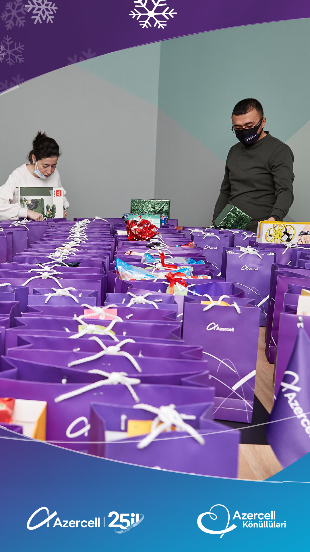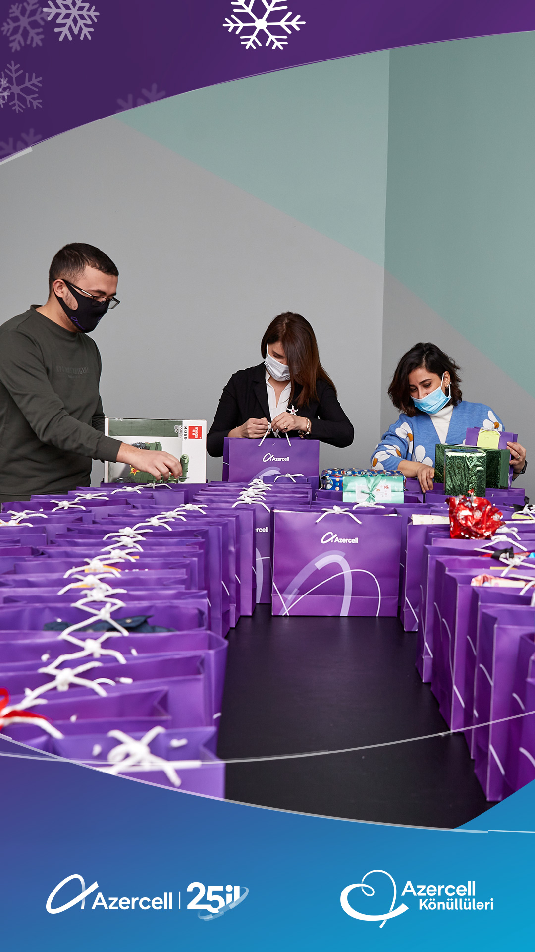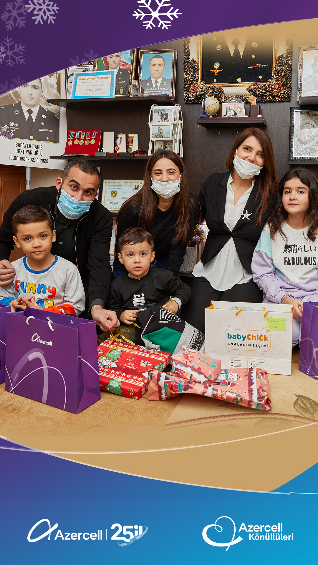 Azercell Telecom, whichcelebratedthe 25th anniversary of itsactivity, fromthefirstyears of itsexistence, hasformed a largecharityteam"Azercell Volunteers",consisting of Azercell employees.Thisyear, as inpreviousyears, “Azercell Volunteers”havelaunchedanothercharityinitiativeforchildren on the occasion of the Solidarity Day of World Azerbaijanis and the New Year. As part of thecampaign "Meet the New Year with giftsfromvolunteers", theyvisitedthefamilies of martyrs and veterans of the Second Patriotic War, as well as low-incomefamilies, and broughtjoy by presenting holiday gifts to their children.