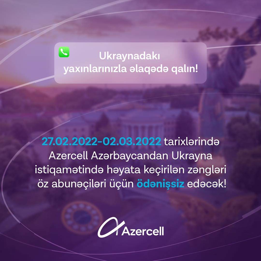 Due to the military situation in Ukraine “Azercell Telecom” LLC will provide free phone calls from Azerbaijan to Ukraine for all Azercell subscribers from February 27 to March 2, 2022, in order to ensure uninterrupted communication with Azerbaijani citizens currently in Ukraine, as well as with relatives of our citizens living in this country.