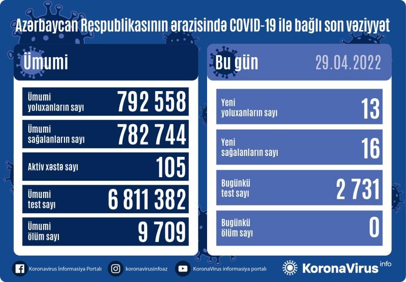 13 new cases of coronavirus (COVID-19) infection have been registered in Azerbaijan, 16 people have been treated and recovered.