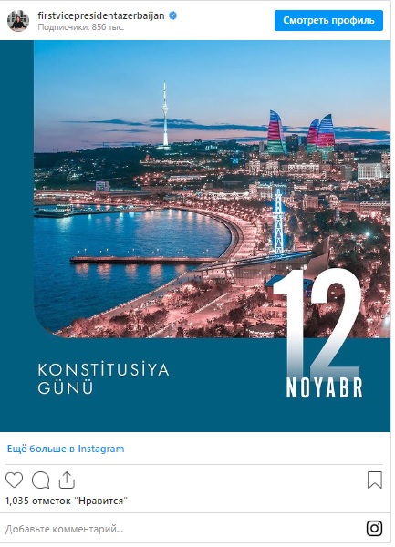 The First Vice-President of Azerbaijan Mehriban Aliyeva made an Instagram post on the occasion of November 12 - Constitution Day o Azerbaijan, SİA informs.