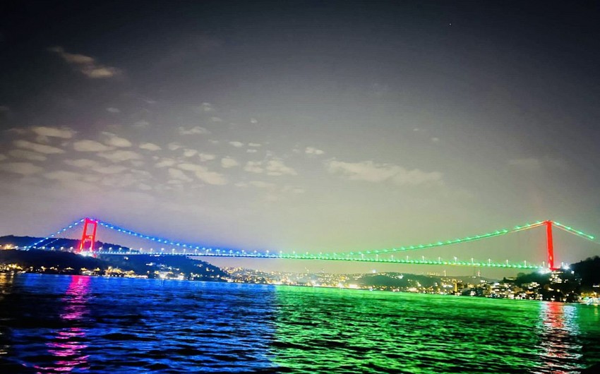 Famous bridge in Istanbul illuminated in colors of Azerbaijani flag