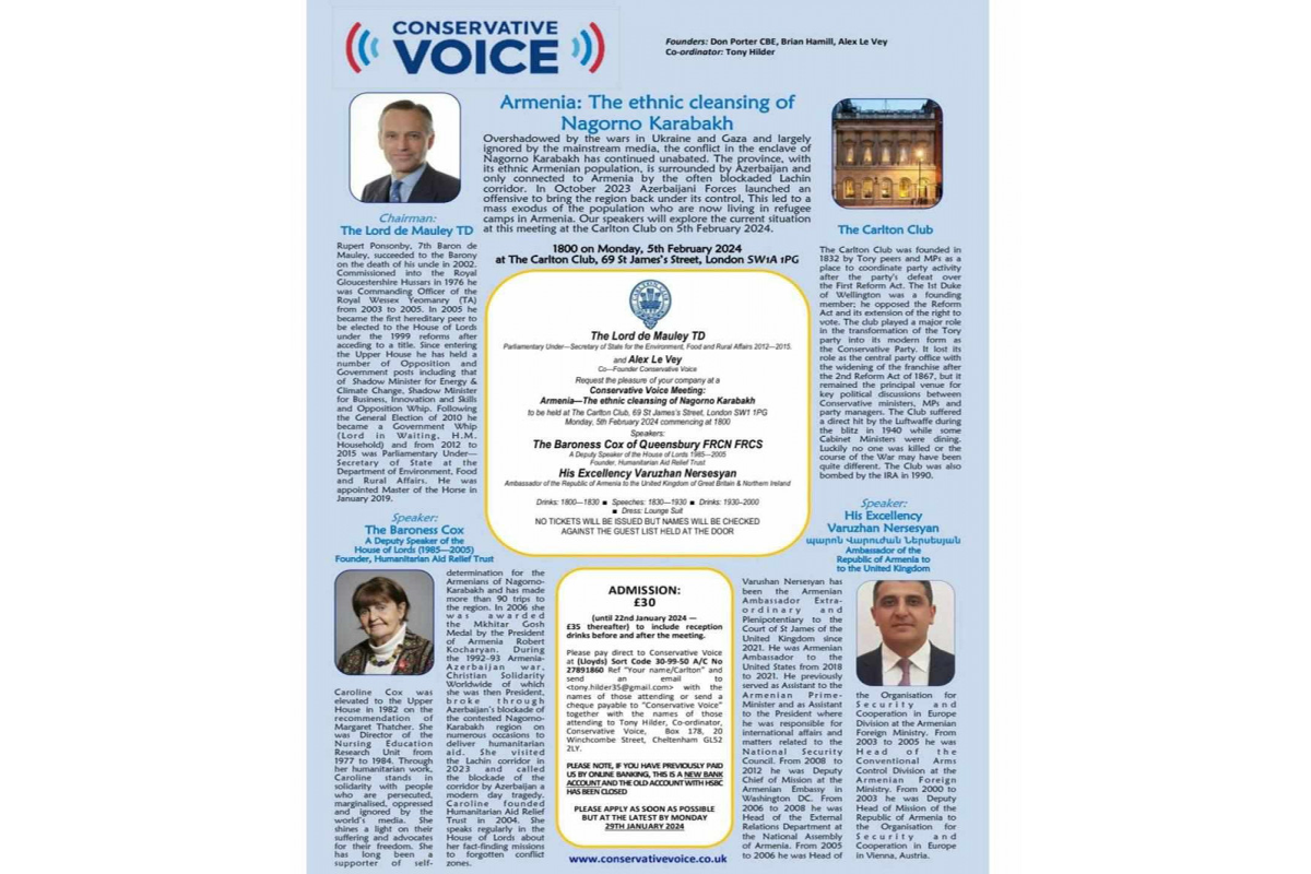 Having heard about this, the British Azerbaijanis Society sent an open protest letter to the leadership of the Carlton Club on behalf of the Azerbaijani Community operating in the country. A copy of the letter was sent to David Cameron, Foreign Secretary of United Kingdom, the members of the UK’s House of Lords - Graham Thomas Evans, Tariq Mahmood Ahmad, Baron Ahmad of Wimbledon, Aamer Sarfraz, Manzila Pola Uddin, as well as, to Minister of State for Europe and North America of the United Kingdom of Great Britain and Northern Ireland Leo Dockerty, Chair of the Foreign Affairs Select Committee of UK Alicia Kearns, and the leadership of the “Conservative Voice” Organization.