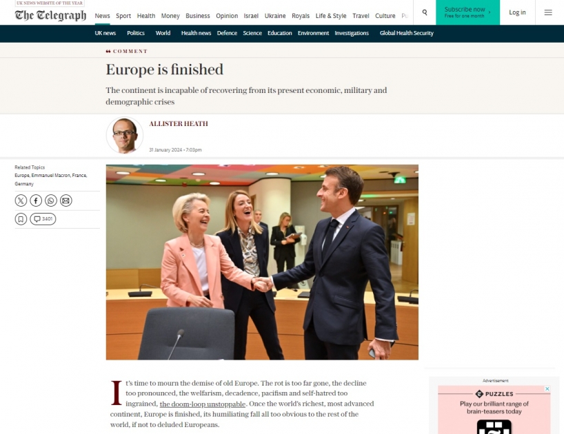 “The continent is incapable of recovering from its present economic, military and demographic crises. It’s time to mourn the demise of old Europe. The rot is too far gone, the decline too pronounced, the welfarism, decadence, pacifism and self-hatred too ingrained, the doom-loop unstoppable,” says the article Headlined “Europe is finished” published by The Telegraph newspaper.