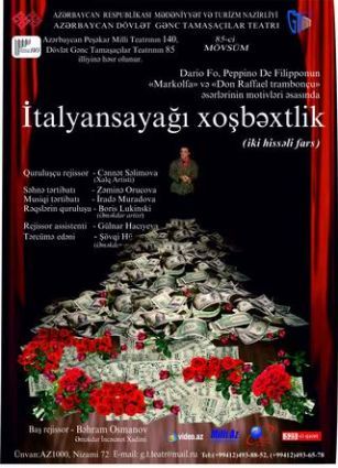 В Театре Юного зрителя состоялась премьера спектакля "Счастье по-итальянски". По сообщению SİA, постановщиком спектакля из двух частей, подготовленного на основе произведений ведущих итальянских драматургов Дарио Фона - "Маркольфа" и Пепино Де Филиппа - "Дон Рафаэль-тромбонист" является народная артистка Джанат Салимова, постановщиком танцев – народный артист Борис Лукински, художественный дизайнер Замина Оруджова, музыкальный редактор Ирада Мурадова, а постановщиком трюков- Иса Асадов. Роли исполнили заслуженные артисты Нюбар Новрузова, Гюляр Набиева, Лейли Велиева, Шовги Гусейнов, Сеидшах Мамедов, Нофель Велиев, актеры Шебнем Гусейнова, Ирада Рашидова, Магеррам Мусаев, Эльнур Гусейнов и Эшгин Гулиев.