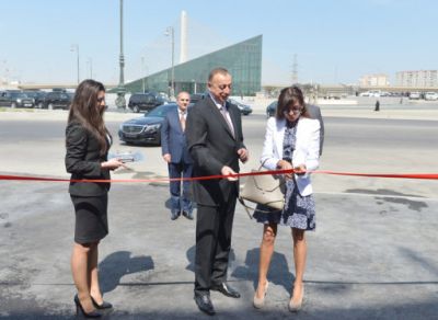 Президент Ильхам Алиев и его супруга Мехрибан Алиева разрезали ленту в знак открытия Национальной гимнастической арены.