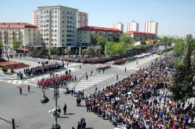 Военнослужащие погранвойск республики под звуки марша, исполненного военным духовым оркестром, внесли на площадь огромный Государственный флаг Азербайджана. Далее свыше трех тысяч учащихся старших классов 50 городских школ стройными рядами прошли мимо памятника, отдавая дань уважения памяти общенационального лидера.
