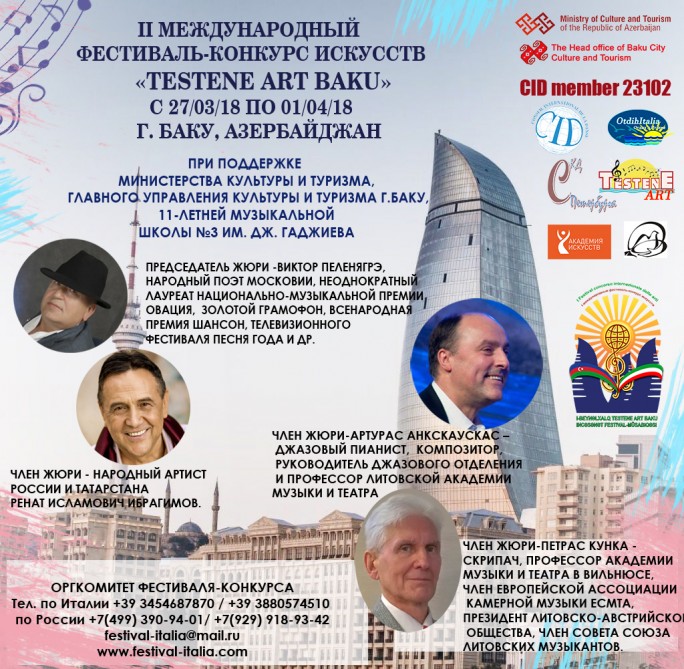 В столице Азербайджана 27 марта – 2 апреля пройдет II Международный фестиваль-конкурс искусств "Testene Art Baku". По сообщению SİA со ссылкой на пресс-службу Главного управления культуры и туризма города Баку, мероприятие пройдет при совместной организации Международной ассоциации культуры Testene Art (Италия) и одиннадцатилетней музыкальной школы №3 имени Дж. Гаджиева при поддержке Главного управления культуры и туризма столицы.