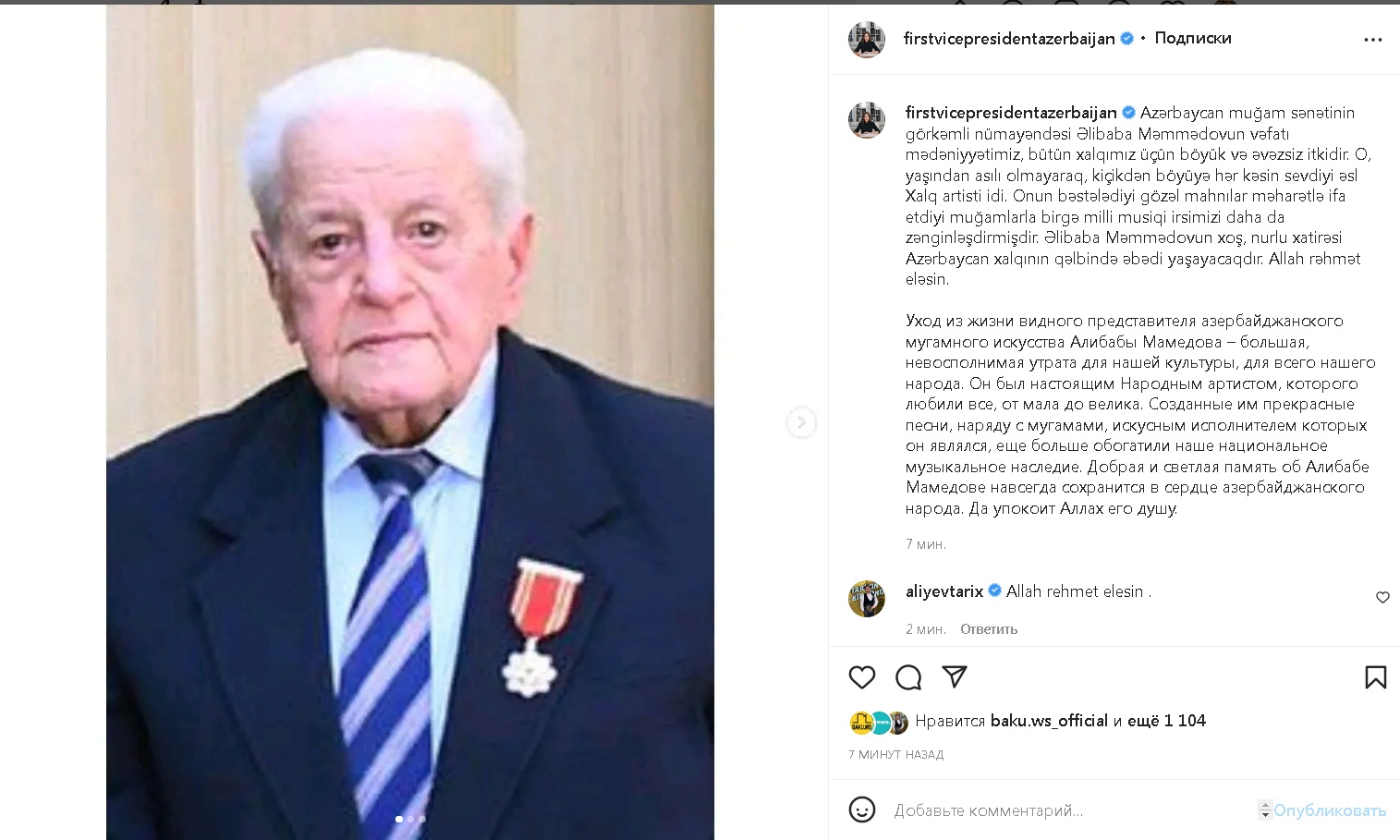 Первый вице-президент Азербайджана Мехрибан Алиева на своей официальной странице в Instagram поделилась публикацией в связи с кончиной народного артиста Алибабы Мамедова.