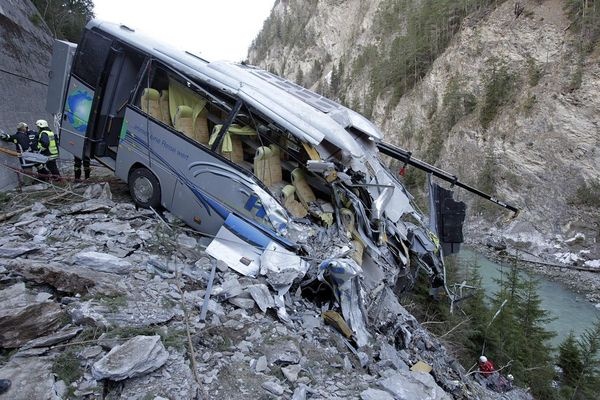 После столкновения автобус, в котором ехали более 50 пассажиров, упал в пропасть с высоты 100 метров.
