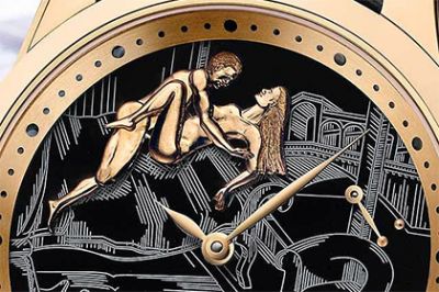 Фоном откровенной сцены стал стилизованный пейзаж Венеции с видом на мост Риальто, выгравированный на циферблате.
