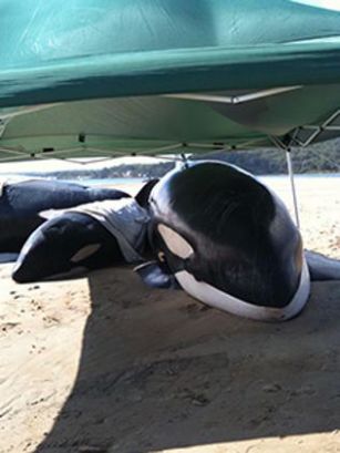 Стая черно-белых китов оказалась в песчаной ловушке после отлива. Две особи - мать и ее детеныш скончались. Еще четверо взрослых китов и один малыш продолжали бороться за жизнь, поднимая хвостами брызги воды и охлаждая себя.