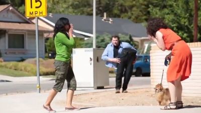 Ничего не подозревающие жертвы розыгрыша спокойно отдыхали в парке, когда на них неожиданно выбегал мужчина, верхняя часть тела которого существовала отдельно от нижней.
