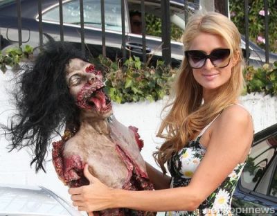Исключением не стала и светская львица Пэрис Хилтон. На днях папарацци заметили Пэрис с целым набором декорация для Хэллоуина. 32-летняя актриса и фотомодель не стала ограничиваться покупкой резиновых пауков, бутафорской паутины и бумажных летучих мышей и купила целый набор жутких изделий. Среди них могильная плита и декорация, выполненная в виде изуродованного тела мертвеца, забрызганного кровью.