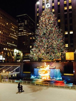 Парень делает предложение девушке около Rockefeller Center в Нью-Йорке.