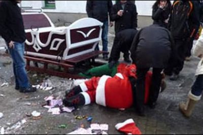Во время движения по дороге парочке на санях посигналила проезжавшая мимо машина, запряженная лошадь испугалась этого звука, встала на дыбы, после чего повозка перевернулась, а Санта и его партнерша врезались в стену на углу улицы.
