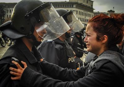 Полицейский и демонстрантка плачут вместе во время акции протеста в Софии, Болгария, 2013 год. Студенты и другие протестующие вышли на улицы города в знак протеста против бедности и коррупции. В итоге многие пострадали.