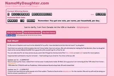 Житель Канады по имени Стивен Маклафлин после обсуждения со своей супругой создал сайт, посетители которого могут подобрать имя его будущей дочери. Об этом пишет The Daily Telegraph. Как передает SİA со ссылкой на Lenta.ru, один и тот же посетитель может проголосовать за тот или иной вариант имени и второго имени для ребенка канадской пары один раз в сутки.