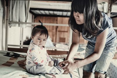 27. Элия играет с дочуркой в комнате общежития, в котором они живут.