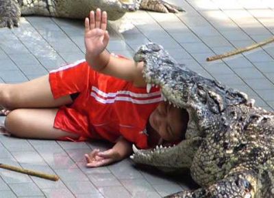 В прошлом году тренеру, на популярной среди туристов крокодиловой ферме, расположенной недалеко от Бангкока, посчастливилось избежать серьезных травм, когда одна из рептилий сомкнула свои челюсти на его голове. Мужчина был укушен, когда его рука скользнула по мокрой земле и он случайно ударил животное по щеке. Дрессировщику наложили 30 швов, но его травмы не были опасными для жизни, пишет Mail Online.